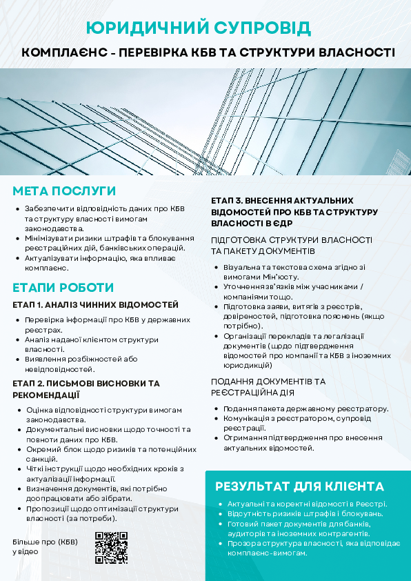 - Не одного, а команду юристів: Замість одного фахівця ви отримуєте супровід команди юридичних експертів для комплексного вирішення завдань.
