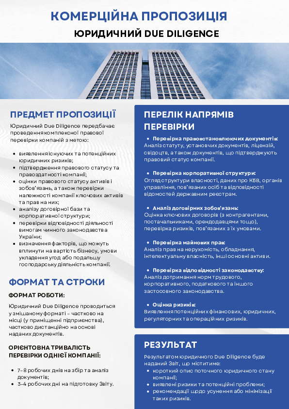 - Правовий супровід реорганізації, припинення/ ліквідації підприємств.